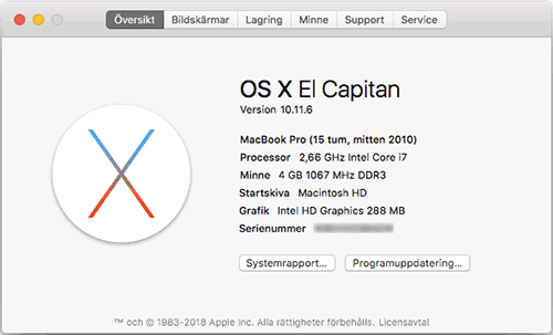 Efter att den datorns OS X hade uppgraderats (kostnadsfritt från Apple) till en något senare version (10.11.6, ”El Capitan”)…